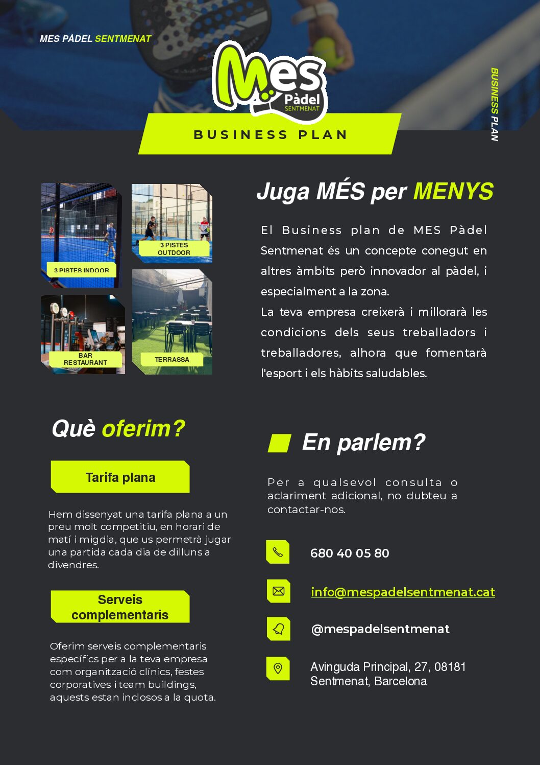 EMPRESES MES PÀDEL BUSINESS PLAN Juga MÉS per MENYS El Business plan de MES Pàdel Sentmenat és un concepte conegut en altres àmbits però innovador al pàdel, i especialment a la zona. La teva empresa creixerà i millorarà les condicions dels seus treballadors i treballadores, alhora que fomentarà l’esport i els hàbits saludables. Contacta amb nosaltres Telèfon 680 40 05 80 Ubicació Avinguda Principal, 27, 08181 Sentmenat, Barcelona Correu electrònic info@mespadelsentmenat.cat